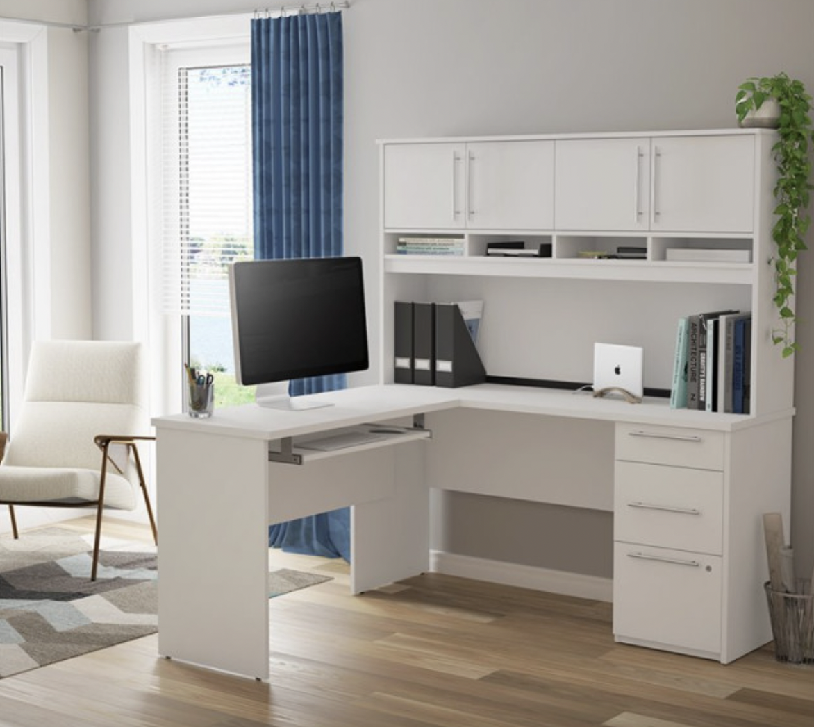 If you're in the market for a new office desk, then you might want to consider an L-shaped desk. The Innova Plus L-shaped Desk is available in white with drawers and a keyboard shelf. It's perfect for small spaces or when there are not enough outlets to charge all your devices. Drawers are conveniently located so that it is easy to find what you need when working on projects. The keyboard shelf provides a place for your laptop and other notebooks while still allowing room for desktop work like using a mouse or writing notes. It features a clean side design with easy-access storage space underneath the work surface. The Innova Plus white wood L-shaped desk will be the perfect addition to your home office!