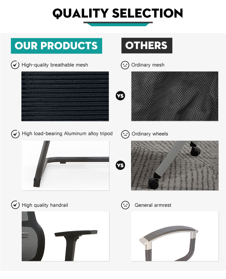 | Material | Fiber reinforced frame; high-density sponge fabric seat; mesh back; PP fix armrest; steel leg with 2mm powder coating finish |