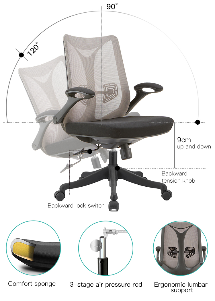 | Material | PP fiber frame, mesh back and fabric seat, high-density sponge, three-level air rod, 320MM five-star feet, 55MM nylon PU casters |