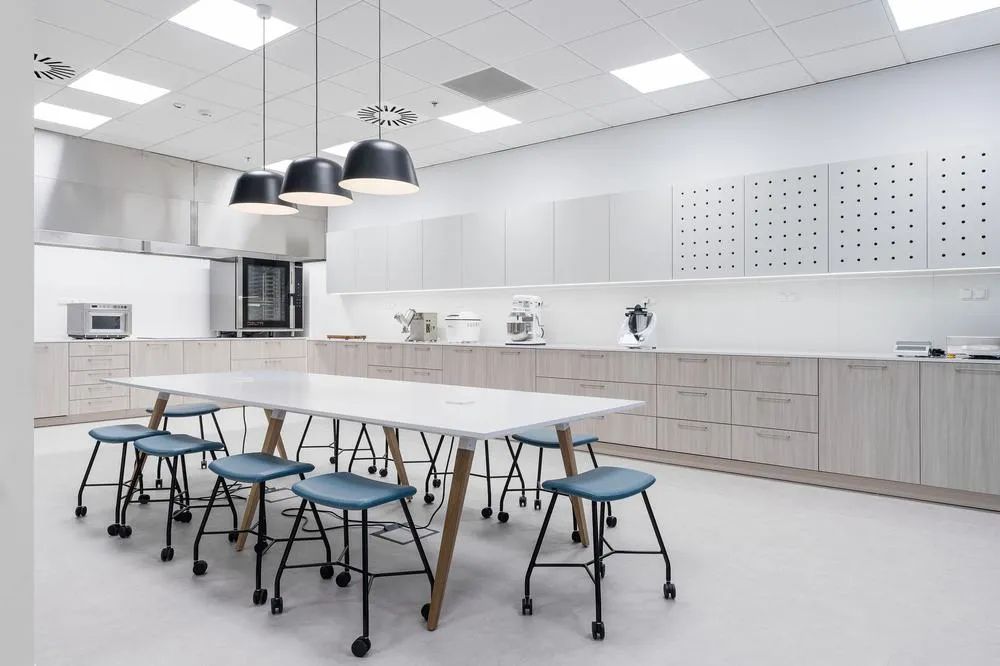 Professional kitchen laboratories require specific solutions due to the need for separate ventilation, special equipment and connections. The laboratory furniture consisted of a custom-made table and seating stools on wheels to allow for free operation on the counter top.