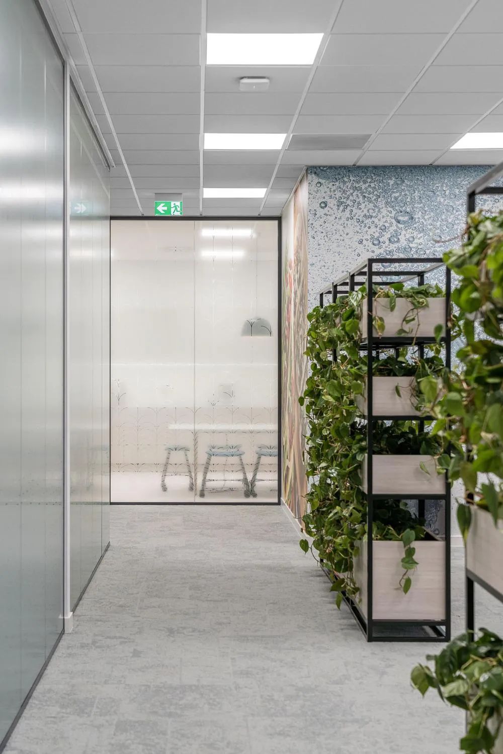 Here you will see lush green plant shelves separating the work areas from the passageways. This design not only creates an acoustic and visual barrier, but also optimizes the air quality inside and greatly emphasizes the brand's strong association with healthy nature. Through the combined efforts of the client, architects, suppliers and non-standard furniture manufacturers, a carefully designed functional plan and color scheme resulted in a stylish and aesthetic space that expresses the brand's culture and realizes its vision.