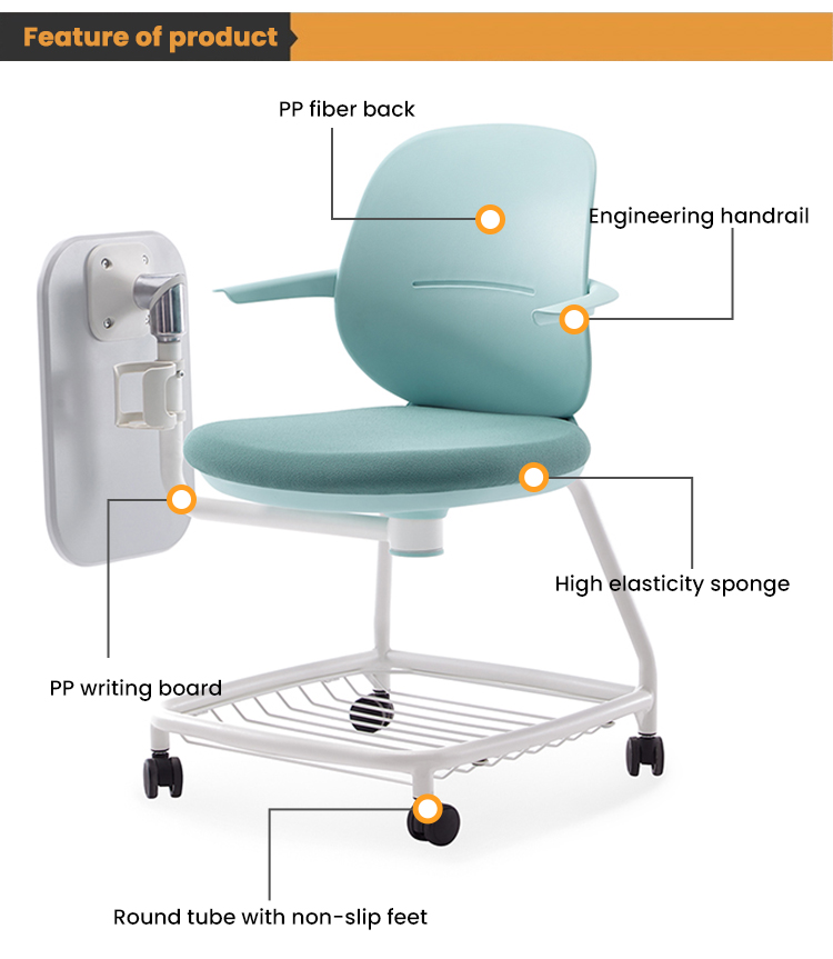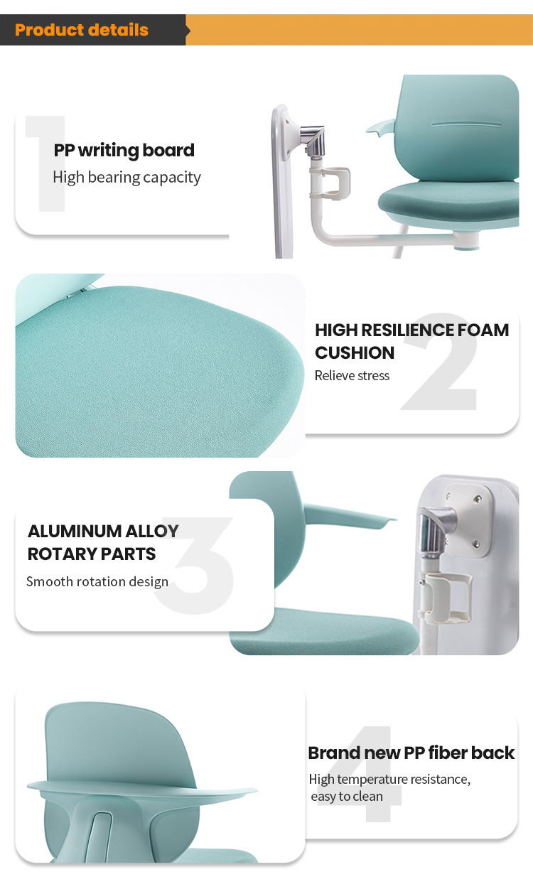 | Feature | Ergonomic design; with foldable writing pad and bookrack; comfortable seat cushion |